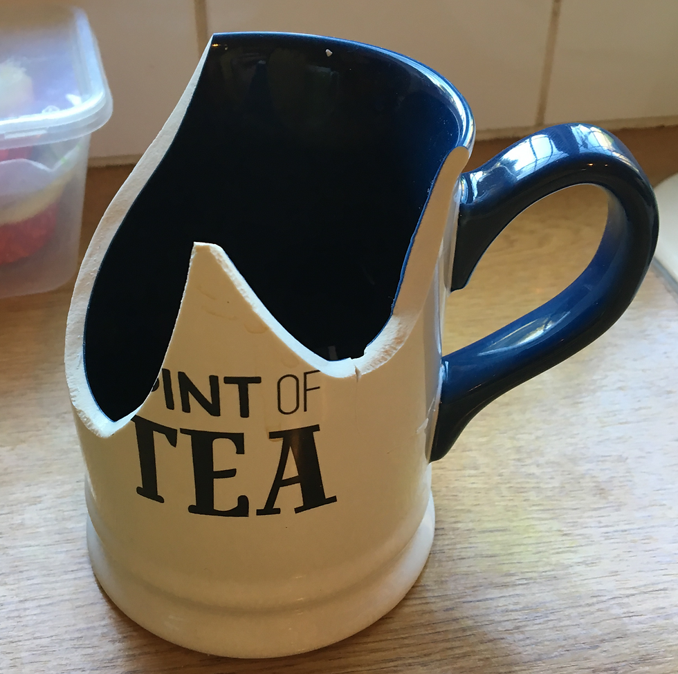 Day 2 of my son's return, everything was going to plan, he got up, showered and dressed for the day without me nagging him. He then went downstairs got his breakfast ready, started to get his sister's breakfast ready for me (as he is a star) while I got her dressed, then SMASH.....there it was, followed by him in tears. I wandered into the kitchen....fuck...he had smashed Grandad's mug (that he always drunk his tea from) there it was lying on the floor....I quickly picked it up, sat them both at the table while I cleared up the loose china on the floor.